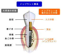 歯科インプラント治療とは、歯の抜けた部分のあごの骨に、デンタルインプラント(人工歯根)を埋め込み、人工の歯をその上に装着する治療法です。| メリット | デメリット | |